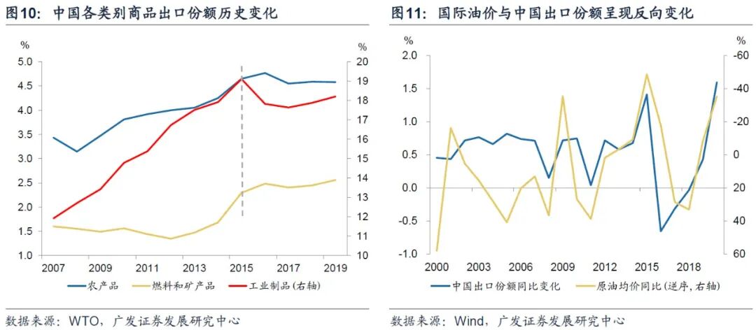 疫情对全球燃料需求、价格和贸易的冲击最显著,这既是对原油出口国的“主动冲击”,也是对非原油出口国的“被动利好”。根据WTO测算显示[2],出行行为大大减少、油价下跌导致2020年燃料贸易萎缩35%,即便到第四季度,农产品和工业制品出口贸易同比明显转正的情况下,燃料和矿产品贸易额同比仍下降了19%(图9)。燃料和矿产品占本国出口比重达到59%(2019年全年占比)的俄罗斯,其2020年出口份额下降幅度是主要经济体中最显著的。而中国出口结构中燃料和矿产品占比极低(2019年占比3.1%),在全球出口中的份额也很低(2019年占比2.6%,图10),历史经验显示,中国出口份额与国际油价的变化在大多数年份呈现出了显著的负向变动关系(图11)。
