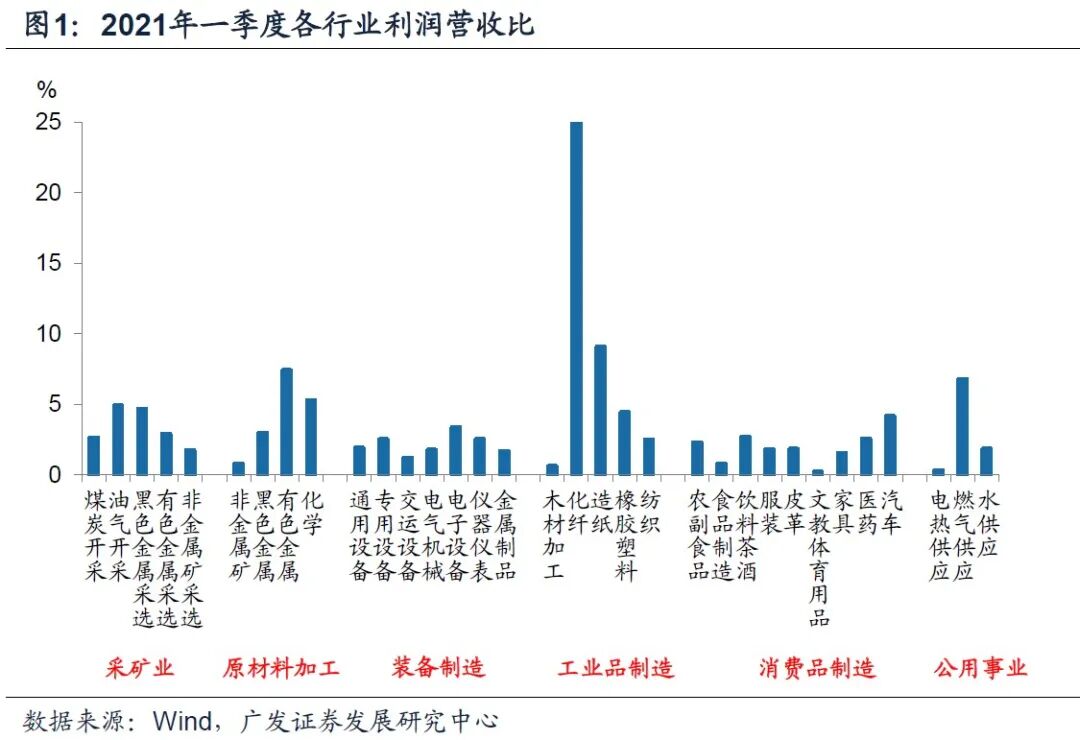 第四,进一步总结一下,一季度利润增速领先的行业可以分为三类:一是同时受益于需求扩张和利润率提升的黑色金属和有色金属;二是显著受益于利润率改善,但需求增长不显著的化纤、造纸、油气开采、化学、燃气供应、塑料橡胶;三是受益于需求扩张,但利润率改善并不明显甚至受到挤压的汽车、医药、中游装备制造业(电子、电气机械、专用设备、金属制品)。简单来说,前两者是中上游,受益于PPIRM的走高;后者是中游和中下游,受约束于PPI-PPIRM的走低。
