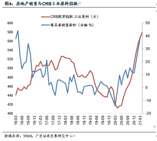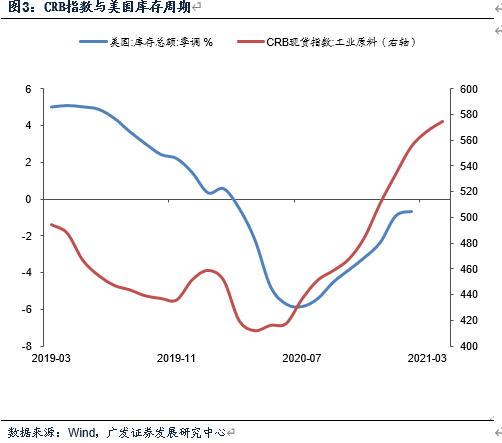 制造业库存周期虽然较为波折,但整体存在补库存效应:国内方面,2019年四季度以中美达成第一阶段贸易协议为起点,国内产成品库存同比触底回升。去年2-3月受疫情突发影响企业被动累库,同期CRB指数大幅回落。4-6月国内防疫形势日渐明朗,出口、建筑链以及工业秩序逐步恢复,企业被动累库斜率放缓。今年以来伴随海外经济复苏、疫苗接种进度加快,国内制造业正式进入主动补库阶段,CRB原材料中枢阶段性走高。
