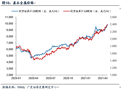 截至4月28日,LME现货铜收于9832.5美元/吨,较3月底上涨11.1%,同比涨幅录得90.2%;流动性层面:本月美元下行对商品价格形成一定支撑。基本面南美等主要产地疫情尚未完全控制,供给负面因素犹存;需求端海外基本面延续复苏,4月发达国家花旗意外指数上行,海外工业品需求景气度回升;国内政策约束下铝矿整体供应有限,供需缺口阶段性拉大。截止4月28日,LME现货铝收于2392.5美元/吨,环比上涨8.2%,同比涨幅录得63.3%。铅、锌、锡、镍现货价环比3月分别上涨6.3%,4.1%,10.5%、7.0%。新能源产业链方面:4月电池级碳酸锂环比持平,六氟磷酸锂环比涨幅录得12.5%,终端延续高景气印证供需缺口依然趋紧,上游价格回升斜率扩大。截至4月28日,Comex金、银期货价环比录得4.0%、7.4%,贵金属价格局部反弹。