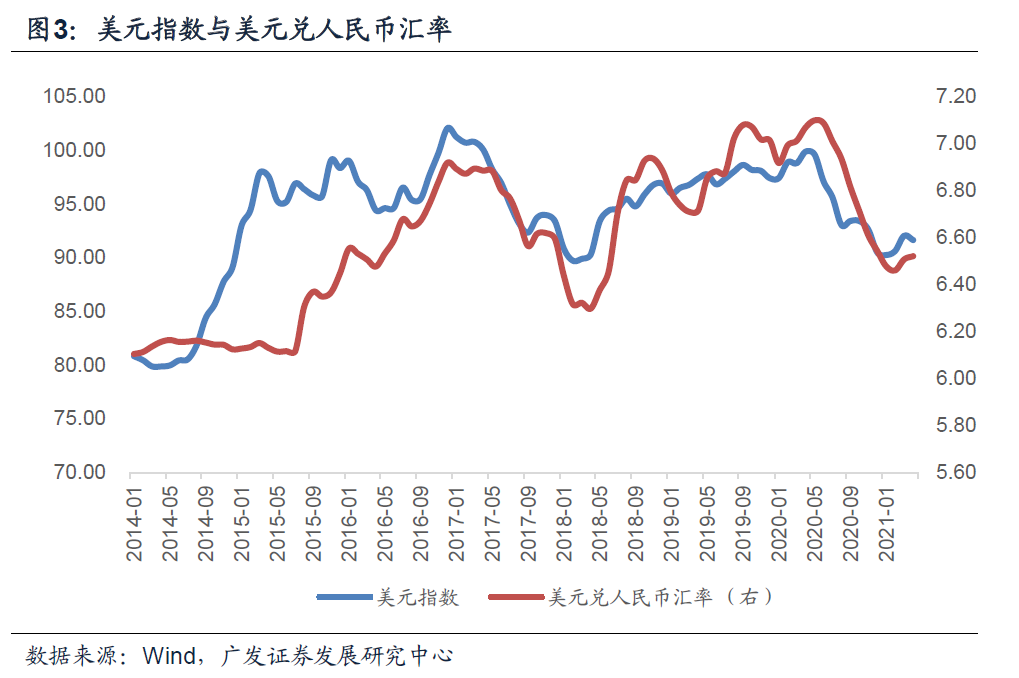 我们常用的人民币汇率标价方式之一是美元兑人民币汇率,它不仅受人民币定价因素影响,同时也会受美元定价因素影响。从数据走势可以看出,2015年之后,美元兑人民币汇率与美元指数相关性变得更强。