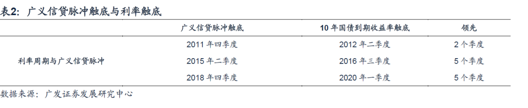 2月以来利率下行较多,10年国债到期收益率已降至3.1%以下。这一方面应是狭义流动性的超预期宽松,金融机构配置压力较大所致,在前期报告《狭义流动性为何持续偏松》中我们已有详细分析;关键是另一方面,从纯粹基本面逻辑的角度,是否能推断出利率的见顶与下行周期的开启?对这一问题,一个较好的切入点是观测广义信贷脉冲周期的变化,它能在一定程度上帮助我们判断利率所处的周期位置与方向。今年前五个月,10年国债到期收益率走势呈先上后下的倒V型。1-2月份,10年国债到期收益率从3.1%附近升至3.3%附近;2月份后,10年国债到期收益率又从3.3%附近降至3.1%以下,目前已是今年年内新低。对这一轮下行背后的逻辑,市场多认为是狭义流动性超预期宽松,金融机构配置压力较大所致,这一点已基本达成共识,主要的争论在于利率是否已经见顶,3.1%以下的利率是否还能继续下行。对此的判断,不同的研究有不同的方法。从货币流动性领域看,一个较好的切入点是观测广义信贷脉冲的变化,它对利率周期有一定的领先性,可在一定程度上帮助我们判断目前利率所处的周期位置与后续方向。广义信贷脉冲是指广义信贷增量占名义GDP比重的变化。我们以滚动12个月的社融增量(剔除股票融资)作为分子,以滚动12个月的名义GDP作为分母,构建了广义信贷脉冲指数。对本轮周期来说,这一指数在2020年三季度已经见顶,2021年一季度已降至2.76%。广义信贷脉冲此前多被海外机构使用,近些年国内投资者关注较多,其最早的内涵是广义信贷增量占名义GDP比重的同比变化。进入国内后,部分研究简化,将其直接定义为广义信贷增量占名义GDP的比重。我们采用初始同比变化的概念,构建了中国广义信贷脉冲指数,其中分子广义信贷增量以过去12个月的社融增量滚动求和值(剔除股票融资)作为代理变量,分母以4个季度的名义GDP滚动求和值作为代理变量。从数据看,中国广义信贷脉冲在2020年三季度达到峰值,为8.41%,与过去两轮信贷脉冲的高点接近。2020年三季度后,广义信贷脉冲开始回落,在2021一季度降至2.76%。考虑到今年二季度社融继续显著收敛,广义信贷脉冲在二季度末大概率会跌入零以下。如何从理论上理解广义信贷脉冲的见顶?一方面,社融增量/名义GDP可以拆解为社融存量同比增速*实体经济杠杆率,在实体经济杠杆率变化相对偏小的情况下,社融存量同比增速*实体经济杠杆率与社融存量同比增速的趋势相近,广义信贷脉冲的变化可视作社融存量的二阶变化,它的见顶回落意味着信用增量的加速度开始放缓;另一方面,广义信贷脉冲可以理解为社融增量对经济贡献率的变化,它的见顶回落意味着创造信用的增长因子(如基建地产)对经济的贡献率在下降。一方面,我们可以将其理解为经过名义GDP标准化后的社融增量的加速度。社融增量/名义GDP=(过去12个月的社融增量/社融存量)*(社融存量/过去四个季度的名义GDP)。前者是社融存量增速,后者如果将社融存量看作是实体债务总量的代理指标,那么即为实体杠杆率。换言之,社融增量/名义GDP=社融存量增速*实体杠杆率。在实体杠杆率的变化相对社融存量增速偏小的情况下,社融增量/名义GDP的趋势会与社融存量增速相似,广义信贷脉冲——社融增量/名义GDP的同比变化可看做是社融存量增速的同比变化,即信用环境的二阶变化。在这种视角下,2020年三季度广义信贷脉冲见顶回落意味着信用增量的增长速度开始收敛。另一方面,我们可以将其理解为社融增量对经济贡献率的变化。名义GDP的增长来源于两类,一类是创造信用的活动产生的,比如对债务依赖度较高的基建和地产投资。我们曾在《信用收缩的三个规律》一文中提及过,基建和地产投资有70%的资金来源是外部融资,基建和地产投资增长推动名义GDP扩张可以看作是社融增量对名义GDP的贡献;另一类是和信用创造无关的活动,比如与外部需求相关的净出口,或居民利用现有收入与存款进行消费等。在这种视角下,广义信贷脉冲的见顶回落意味着诸如基建地产等能够创造信用的增长因素对经济的贡献率在走弱。我们从政策周期角度进一步做一个理解:经济内生增长动能偏弱时政策宽松,广义信贷脉冲上升,受益于信用创造的部门投资回升,然后经济增长动能恢复,政策逐步收敛,广义信贷脉冲因能够加速信用创造的需求受抑制而趋于回落,其余如出口、非借贷消费等增长因素对经济的贡献度仍有上行动能。从历史经验看,广义信贷脉冲见顶后的5个季度左右,经济将趋于见顶。从历史经验看,广义信贷脉冲在大部分时期领先于经济大约5个季度。第一,广义信贷脉冲的回落只是意味着基建地产等加速信用创造的增长因素对经济的贡献下降,其余如出口、非借贷消费等增长因素对经济的贡献度仍有上行的动能,会对前者起到对冲作用。第二,中国的广义信贷脉冲是政策强度的映射,它的见顶回落反而说明经济内生增长动力偏强。在经济较差时,政策宽松稳增长,受益于政策宽松的基建和地产会率先做出反应,而这两项又是信用创造的两大主要动力,因此广义信贷脉冲会在这一阶段领先经济回升;反之,在经济内生增长动力修复已经形成趋势时,政策会开始寻求退出,财政的强度下降,信用供给收缩,对地产的调控加强,广义信贷脉冲会因为能够创造加速信用创造的需求受到抑制而率先回落。![]()