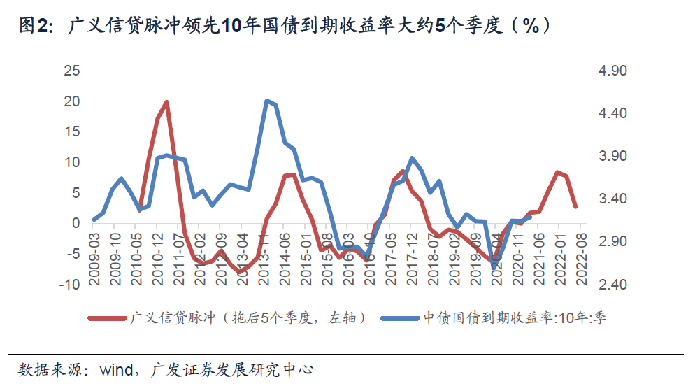 由于利率周期主要由经济周期决定,故广义信贷脉冲对利率周期也有一定的领先性。从历史数据看,金融危机后,大部分时期广义信贷脉冲领先10年国债到期收益率大约5个季度。2013年曾经出现过非常明显的偏离,广义信贷脉冲在二季度见顶,10年国债到期收益率在四季度出现尖顶,广义信贷脉冲仅领先利率周期2个季度,这可能与2013年金融市场出现钱荒,利率出现了与经济基本面不相符的超调有关。由于利率周期主要由经济周期决定,两者的中期变化基本一致,因此广义信贷脉冲领先经济周期意味着它也同样领先利率周期。如果以10年国债到期收益率作为利率的代表,我们会发现金融危机后,广义信贷脉冲大部分时期都领先利率周期大约5个季度。![]()