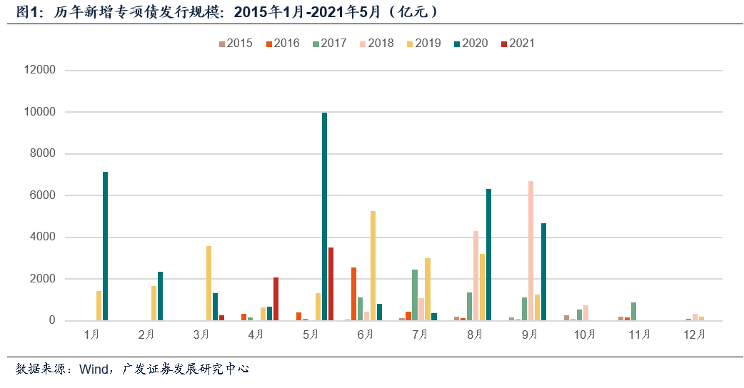 第一,证券时报报道,5月财政部下达地方新增债额度42676亿元,其中一般债务限额8000亿元,专项债务限额34676亿元。关于这一信息我们简要谈几点理解。第二,如何理解这样一组数字?(1)它与两会公布的44700亿元新增限额(其中新增一般债8200亿元、新增专项债36500亿元)对应,但规模上有小幅差距(一般债低200亿,专项债低1824亿);(2)严格来说,这一数字仅能反映截至5月底财政部下达各地的新增地方债额度尚未达到此前两会公布的额度,待6月底财政部发布“2021年5月地方政府债务限额情况”才能进一步确认全年限额是否发生调减;(3)考虑到3月下达的23580亿元表述为“提前下达”,相当于往年的“提前批”,5月发行情况表述为“下达”,因此最新公布的42676亿元的确有较大可能已代表全年额度。第三,如果这是全年最终的额度,后续不再有第三次下达,那么是什么原因导致额度的小幅下调?(1)去年扩张性政策在今年上半年仍有部分留存资金可用;(2)年初财政预算设定积极超出预期,本身存在调整空间;(3)今年上半年出口景气度较高,稳增长的压力较小;(3)专项债的“穿透式监管”推进,项目审核更加严格。值得注意的是,34676亿元的专项债限额不是一个约数,它可能对应着穿透式监管之下更精细的匹配。第四,需要指出的是,由于今年前五个月财政进度偏慢,市场本来就存在3.65万亿的专项债限额可能不会发行完毕的预期,限额的小幅调整影响不会太大;而且,调整的落地和一个更精细的额度反而增加全年发行完毕的概率。往年专项债存在的一个问题是项目前期准备不足导致资金闲置,更加严格的项目审核和匹配之下,专项债的后续推进和使用效率也会有一个提升。第五,今年财政后置的特征也并未因此有任何改变。截至5月的新增专项债发行进度仅为16.5%,显著低于去年的57%、前年的40%,6-9月预计仍将迎来一波发行高峰;财政发力的主要时段仍大概率落在三季度和四季度前半段,这一点将对下半年经济形成支撑作用。整体来看,今年的财政和地方债节奏将更接近2017-2018年,而非2019-2020年。证券时报报道,5月财政部下达地方新增债额度42676亿元,其中一般债务限额8000亿元,专项债务限额34676亿元。关于这一信息我们简要谈几点理解。证券时报报道[1],财政部政府债务研究和评估中心发布的“2021年5月地方政府债券发行情况”显示,经国务院批准并报全国人大常委会备案,财政部下达2021年新增地方政府债务限额共计42676亿元。其中,一般债务限额8000亿元,专项债务限额34676亿元。如何理解这样一组数字?(1)它与两会公布的44700亿元新增限额(其中新增一般债8200亿元、新增专项债36500亿元)对应,但规模上有小幅差距(一般债低200亿,专项债低1824亿);(2)严格来说,这一数字仅能反映截至5月底财政部下达各地的新增地方债额度尚未达到此前两会公布的额度,待6月底财政部发布“2021年5月地方政府债务限额情况”才能进一步确认全年限额是否发生调减;(3)考虑到3月下达的23580亿元表述为“提前下达”,相当于往年的“提前批”,5月发行情况表述为“下达”,因此最新公布的42676亿元的确有较大可能已代表全年额度。最新公布的42676亿元新增限额这一规模小于此前人大会议安排的44700亿元(其中新增一般债限额8200亿元、新增专项债限额36500亿元)。为理解这个问题,我们先简要回顾包括今年在内的各年地方债额度下达情况:各地政府自发自还地方债始于2015年。根据预算法,地方新增债额度需通过国务院报全国人大或全国人大常委会批准;全国限额确定后,财政部将根据各省情况将额度分配至各省级财政部门。完成上述流程后,各省才可以发行地方政府新增债。因此,2015-2018年第一批地方新增债发行时间通常发生在4-5月,且首月发行规模往往极小。这就造成了新增债发行时间较晚、发行节奏不均衡、一至二季度出现发行空窗期等多个问题。基于此,2019年起国务院有权提前下达部分新增债额度至各省用于填补前期空白,故2019-2020年地方新增债发行时间均提前至1月份,发行节奏相对之前大幅前倾,整体节奏更加均衡(图)。2021年依然存在“提前批”额度,但下达时间从过去的上年末(2019年、2020年第一批提前批分别于2018年12月底、2019年11月底12月初下达各地),推迟至今年3月初——财政部政府债务研究和评估中心发布的“2021年3月地方政府债券发行情况”、“2021年4月地方政府债券发行情况”中均提到:“经国务院批准并报全国人大常委会备案,财政部提前下达2021年新增地方政府债务限额23580亿元。其中,一般债务限额5880亿元,专项债务限额17700亿元。”这一表述直至5月发行情况才有所改变,即前文提到的下达42676亿元。综上,今年3月第一次下达新增地方债额度23580亿元,5月第二次下达新增地方债额度42676亿元(含第一次下达额度)。42676亿元较此前两会公布的44700亿元收缩了2024亿元。目前来看,现有信息依然无法直接推导出今年全年的地方新增债额度减小这一结论,待6月底财政部发布“2021年5月地方政府债务限额情况”[2]即可了解全貌。但考虑到3-4月发行情况表述为“提前下达”,5月发行情况表述为“下达”,因此全年额度的确存在较两会公布额缩小2024亿元的可能性。其中,一般债务限额缩小200亿元,专项债务限额缩小1824亿元。![]()