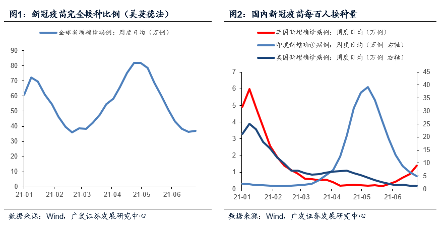 6月全球疫情延续改善:周度日均新增确诊病例由5月末的51万例降至6月第四周的37万例,降幅达27.5%。同时由于德尔塔毒株的强传染性,6月多国疫情出现局部反复,其中以英国、以色列等接种进度较快国家尤为引发关注:英国周度日均新增病例从5月末的2900例升至6月第四周的1.4万例,以色列周度日均新增病例由5月末的20.7例升至6月第四周的142例。