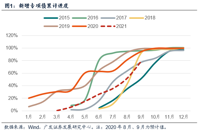 1-7月新增专项债的发行进度达36.5%,仍落后于2019年、2020年的78%、60%,还余额度23341亿元待发,这意味着8-12月的发行压力较大,其中8月各地计划发行规模预计约6000亿元。而9月作为三季度的最后一月,历年来发行规模均不小,在开年进度偏慢而需要赶进度的年份更加明显,2015-2020年9月新增专项债发行占比分别为16%、1%、14%、50%、6%、13%(图1),因此我们预计9月发行规模将较8月进一步提升,占全年额度比重至少应在20%左右,即至少应有8000亿元发行规模,大概率位于8000-12000亿元左右。