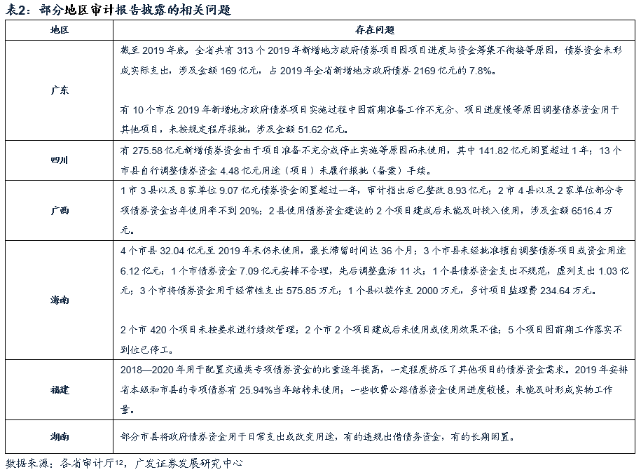第一,自地方债发行到财政资金拨付本身存在时滞与资金闲置等问题,多地审计局曾表示由于项目准备不充分、项目进度缓慢或停止实施、自行改变对应项目或用于日常支出经常性支出等原因造成部分地区资金沉淀(表2),2020年这一问题更加突出,故去年年中财政部发文表示“对因准备不足短期内难以建设实施的项目,允许省级政府及时按程序调整用途……合理简化程序,确保年内形成实物工作量”[8]并多次强调会进一步完善专项债管理制度有效解决资金闲置问题。