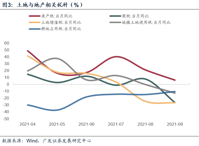 9月收入同比增速由正转负的主要贡献来自土地与地产相关税种,其中房产税、契税、土地增值税、城镇土地使用税分别下行了14.9、34.1、2.1、12.4个百分点至6.2%、-26.3%、-26.7%、-12.4%、-10.4%。而耕地占用税同比降幅小幅缩窄至-10.4%。整体来看,9月土地与地产相关税种共拉低财政收入2.8个百分点,延续了8月以来的下行趋势,显然与同期政策影响下的地产市场降温有关。
