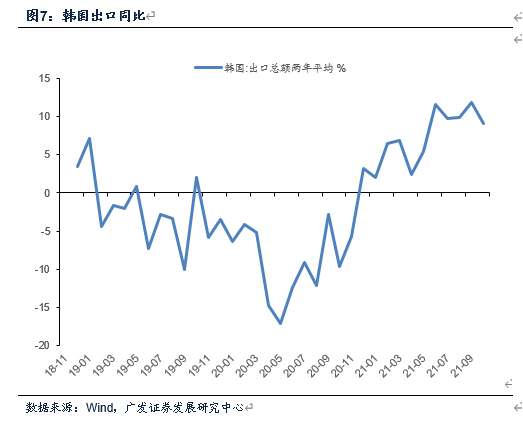 中港协数据显示,10月上中旬沿海主要枢纽港口外贸货物吞吐量同比分别增长0.6%、-3.1%,低于9月下旬增速但高于中上旬读数(9月上中下旬分别为-6.4%、-15.1%、11.7%)。10月韩国出口仍属高增区间,同比增速录得24%(8月全月34.7%、9月全月16.7%);两年平均增速9.1%(8月全月9.9%、9月11.9%),韩国出口大致属韧性区间。国内航运运价数据高位震荡,截止10月29日,CCFI综合指数刷新历史新高3277.7,环比上涨1.8%,SCFI指数环比回落0.7%。
