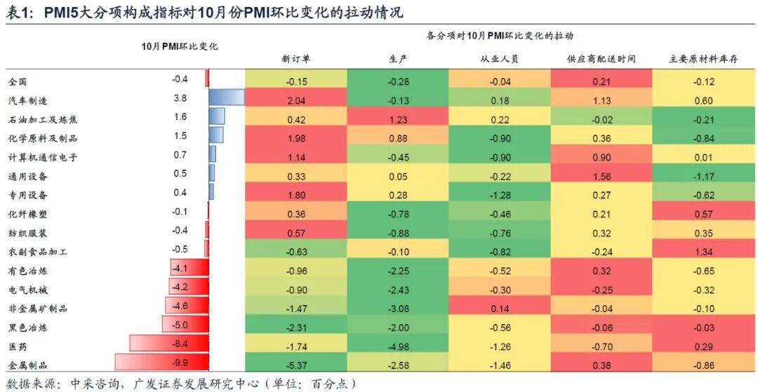 10月份制造业PMI49.2,较9月份回落了0.4个百分点。从PMI的5个分项构成拆解来看,生产活动景气度下滑仍然是主要原因,生产项环比下降1.1个百分点,拖累PMI环比下降0.28个百分点,贡献了10月份PMI环比降幅的70%,与9月份的贡献度是相当的(表1)。当然,需求也在下滑,新订单项环比下降0.5个百分点,拖累PMI环比降幅0.15个百分点,贡献了10月份PMI环比降幅的37.5%(9月份为18%)。