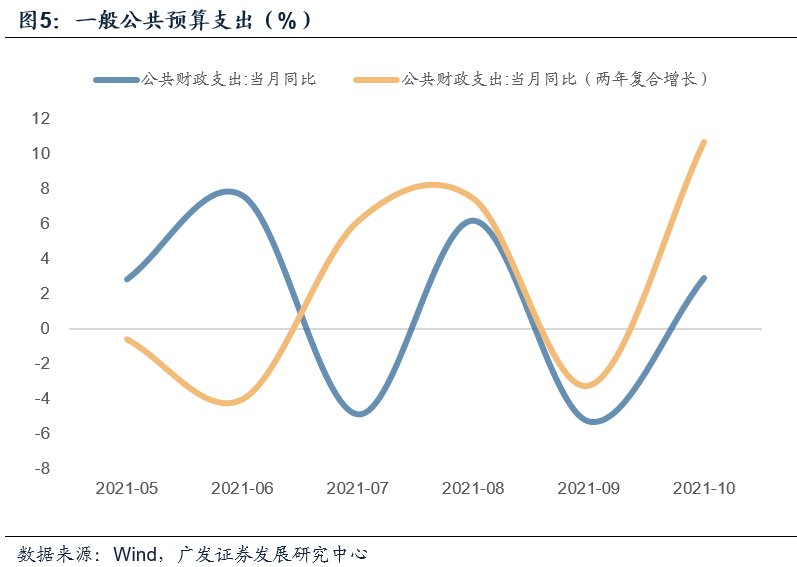 若扣除2020年的高基数因素,则教育、卫生健康以及城乡社区事务的复合同比增速均有所回升,分别由-4.6%、-6.6%、-34.3%回升至12.7%、29.2%、160.2%。需要注意的是城乡社区事务虽然部分包含基建支出,也拉动了基建三项支出的复合增速有所回升,但该部分非基建部分占比也较多,难以甄别,而10月的交通运输支出和农林水事务又明显偏弱。10月单月的基建投资增速仍处于负增区间与前期持平,复合增速较前期的0%略微提升至1.1%。