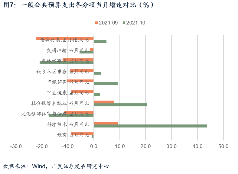 第五,具体来看,10月支出分项中表现最强的有科技、社会保障和节能环保,分别录得43.8%、20.5%和9.3%的较高增速;在扣除去年高基数影响后,教育、卫生健康、基建三项支出也略有回升,复合增速分别有12.7%、29.2%、8.4%,其中基建三项的主要拉动力量来自城乡社区事务,其他两项仍为负增。但需要注意的是城乡社区事务还包含了非基建的部分,难以甄别。