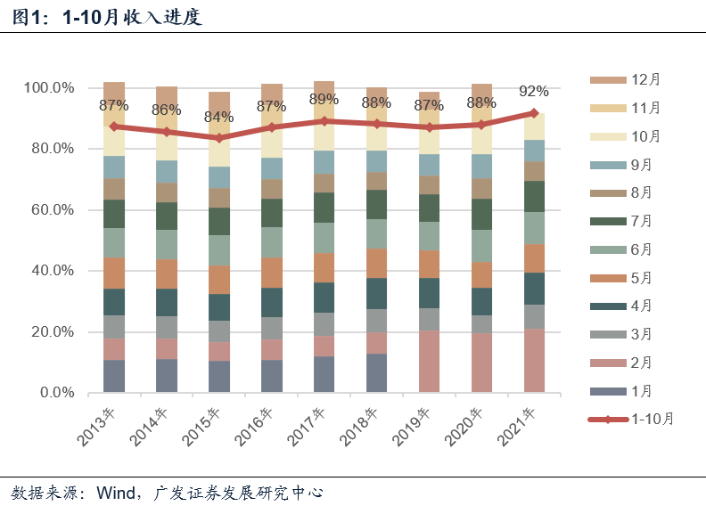 从收入进度来看,10月收入占比达8.9%,与2018-2019年同期基本持平,但弱于近年来的其他10月表现。在今年收入目标预算数设定相对谨慎的大前提下,这一表现相对较弱,故从占比角度来看10月收入表现依然延续了8月以来的回落趋势。