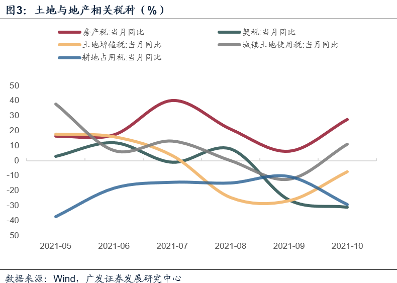 首要观察的是在9月形成较大负贡献的土地与地产相关税种,但10月这些税种表现有所回温,五项税合并后的同比降幅由22.7%收窄至2.7%,两年复合增速也由前期的-7.9%转正至5.5%。分结构来看,这一回升趋势主要受到了房产税、土地增值税和城镇土地使用税的上拉作用。这与10月地产相关指标全线回落是相悖的,但短期内这部分的下行趋势仍是相对确定的。