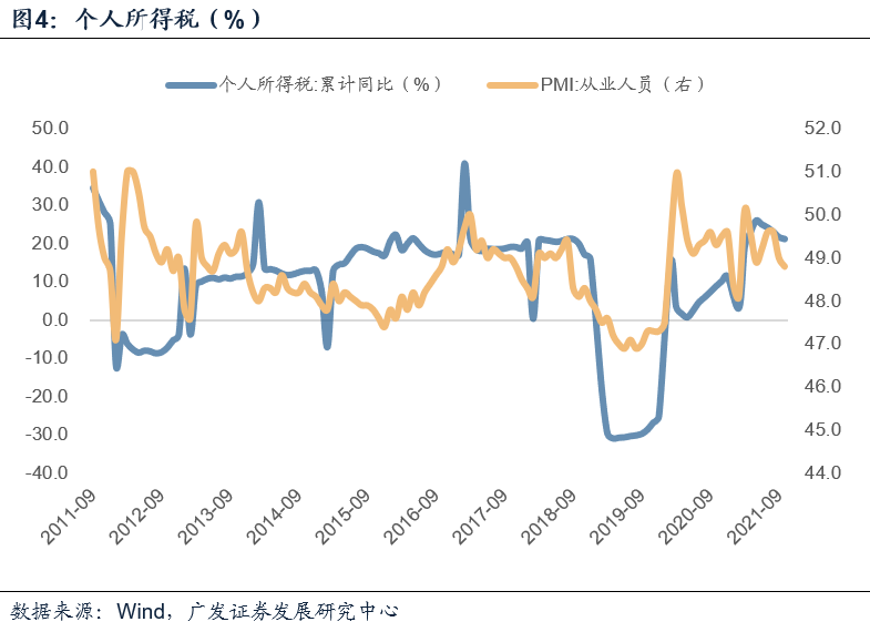 整体来看,今年四项税种中除上文提到的个人所得税外,受PPI高位支撑的企业所得税表现也较为强劲,1-10月累计拉高财政收入同比3.4个百分点。前三季度工商业增值税同比增长22.2%,主要受工业生产持续增长,特别是工业生产者出厂价格高位运行的影响。