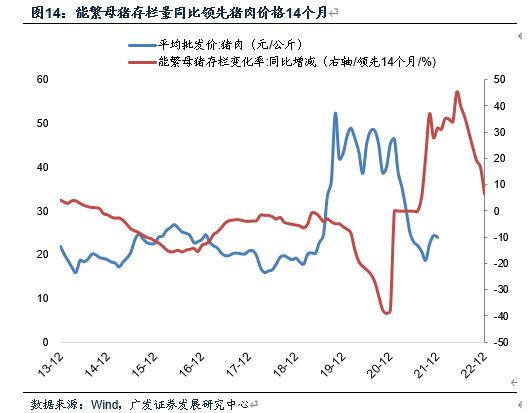 猪价:节前受极端天气与疫病影响,下半年供给出清加速价格探底。国庆节后猪价超跌反弹主要在于大猪存栏比重下降及消费提振,春节前受寒潮与疫病影响,叠加季节性需求猪价或偏强运行。(据广发农业组观点)从行业资金链的角度考察,过去两年资本开支力度较大的企业或面临较大资金压力;从行业亏损程度以及持续时间来看,明年上半年或为生猪供给的峰值观察窗口。考虑到能繁母猪存栏量拐点对于生猪供给的领先关系仍较稳定,明年下半年或将进入产能去化博弈尾声、供给指标确定回落的反转阶段。