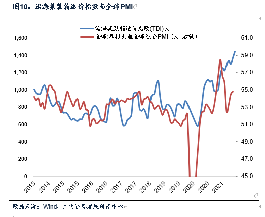 考察外需定价因素对于2022年工业品通胀周期的影响。首先本轮CRB和PPI走高有着复杂背景:其一是全球经济于疫情集中冲击后逐步修复,进而带动商品需求回升。本轮国内、海外经济触底时序分别落于去年2月与4月,今年下半年经济形态逐步过渡至减速复苏,同期代表商品价格的CRB指数于去年5月高斜率回升,今年6月至今高位徘徊;其次是极端天气严重拖累全球绿色能源生产。扰动因素包括今年风力发电骤降、极端干旱天气影响等,叠加传统能源产能出现瓶颈,供需缺口有所扩大;第三是全球航运价格助推。全球贸易秩序失衡导致集装箱供给不足、调配失序,航运价格高企进一步推升通胀中枢。最后全球清洁能源政策推行,海外页岩油供给受限。拜登政府将石油行业和可再生能源替代作为施政纲领之一,大力发展清洁能源的同时对于传统能源的供给自调整亦形成额外约束。页岩油产能亦成为推升供给矛盾因素之一。