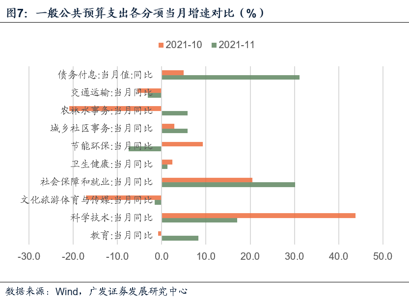 分结构来看,11月支出分项同比增速由高到低依次为:债务付息(31.1%)、社保就业(30.2%,两年复合增速24.1%)、科学技术(17.0%,两年复合增速0.6%)、教育(8.2%,两年复合增速14.8%)、城乡社区事务(5.8%,两年复合增速17.1%)、农林水事务(5.8%,两年复合增速2.3%)、卫生健康(1.3%,两年复合增速30.8%)、文化旅游体育与传媒(-1.6%,两年复合增速3.0%)、交通运输(-3.2%,两年复合增速6.3%)、节能环保(-7.5%,两年复合增速-6.3%)。