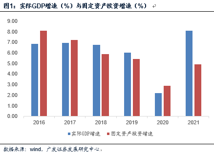 GDP的拉动力量无非是消费、净出口、资本形成。从历史数据看,如没有疫情影响,名义消费增速的中枢一般持平于名义GDP增速(见2021年5月《为什么消费恢复相对偏慢》);出口增速波动较大,但如果我们算一下过去10年的年均复合增速,则大致在5.9%左右,这个也并不高于名义增长率。这意味着资本形成速度至少要不低于名义GDP增长率。正如我们在年度报告《固本,培元》中所观察到的,中国经济对这一点高度敏感。经验观察的时候一般用固定资产投资指标替代资本形成,由于前者增速基本上稳定低于后者,我们可以用实际GDP代替名义GDP当作大致坐标。我们发现,凡是固定资产投资增速低于实际GDP增速的年份,经济就明显有失衡特征;凡是固定资产投资增速高于实际GDP增速的年份,GDP增速即使低,微观上一般也比较稳定。