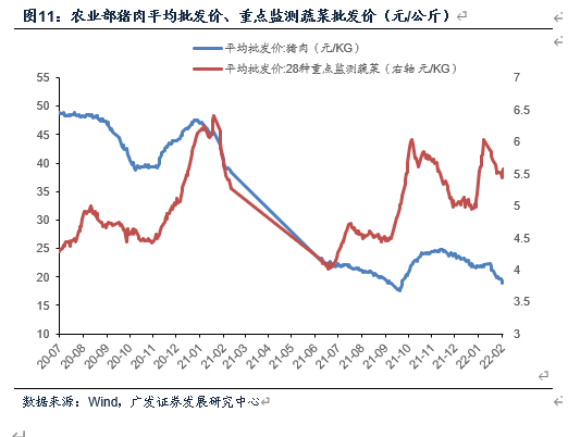 伴随节日效应及开学效应影响趋弱,2月下旬猪肉需求进入季节性淡季;此外上半年供给峰值逐步来临,北方地区生猪出栏体重呈逐步回升之势。截至2月28日,农业部猪肉平均批发价录得18.5元/千克,环比回落16.0%。全国蔬菜供应总体偏松:28种重点监测蔬菜平均批发价环比回落5.6%(前值19.6%),7种重点监测水果平均批发价环比回落2.7%(前值9.3%)。我们在前期报告中提到:中期看菜价并不存在大幅上涨基础,度过季节性峰值后可能会出现较明显的压力缓和。截至2月28日,粮食价格涨跌互现,粳稻、玉米期货价相较上月末持平、俄乌局势升温推动优质小麦上涨9.6%。非食品项影子指标义乌小商品指数环比持平。