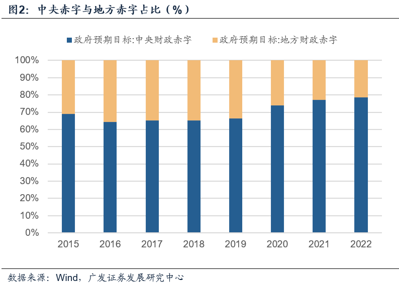 在33700亿元的目标赤字中,中央赤字26500亿元(对应国债),环比少增1000亿元,占比79%;地方赤字7200亿元(对应地方新增一般债),环比少增1000亿元,占比21%。中央赤字规模这一占比较2020-2021年的74%-77%进一步提高。自疫情以来,为缓解地方财政压力,中央财政的重要性逐年上升,疫前2015-2019年中央赤字规模占比均值仅为66%。