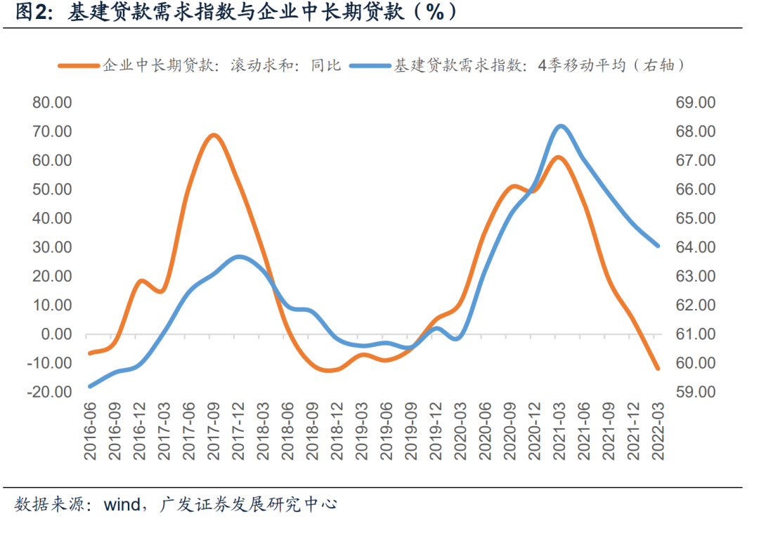 从经验看,基建贷款需求是企业中长期贷款的主要驱动因素,2021年末基建领域中长期贷款占企业中长期贷款余额接近40%,基建贷款需求指数改善时,企业中长期贷款表现往往也不差。今年一季度,由于高基数,企业中长期贷款同比未能改善,后续随着稳增长政策进一步推进,基建贷款需求指数将维持高位,叠加基数逐步走弱(尤其是下半年),企业中长期贷款同比改善的概率会越来越高。