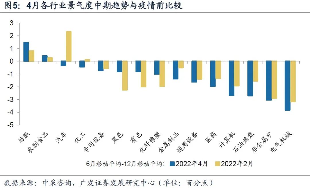 由于疫情对3、4月份数据扰动较大,采用2月份数据对行业的中期趋势特征进行比较。2月份,景气度中期趋势存在改善动能的行业包括汽车、纺服、农副食品、化工。