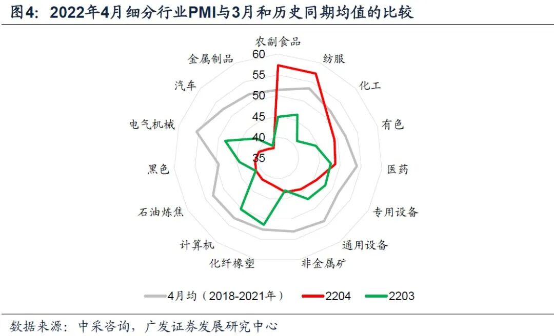 国家统计局在4月解读中提到[1],“虽然制造业景气水平继续下行,但仍有部分行业运行总体平稳,其中保障基本民生的农副食品加工、食品及酒饮料精制茶,以及非金属矿物制品、铁路船舶航空航天设备等行业PMI均高于临界点”。[2]