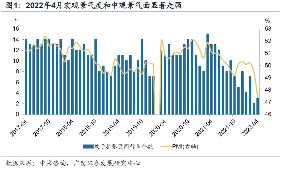 第一,疫情冲击下,4月制造业PMI进一步下挫2.1个百分点至47.4。与此对应,15个制造业行业中处于扩张区间的行业个数仅3个;以季度均值观测,2021年三季度至2022年一季度分别为9.0、6.7、4.3个。