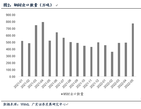 5月钢材出口数量环比增长55.8%,出口数量、出口金额单月同比分别为47.2%、77.8%。