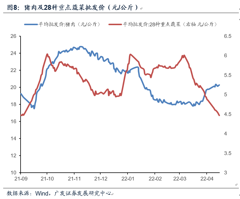 6月猪肉消费处于季节性淡季,但受餐饮消费恢复影响,叠加流通市场猪源循环偏少,屠宰场减量收猪以及压价情绪依然较强;另一方面供给端能繁母猪存栏量降幅超市场预期,散户惜售及疫情物流阻梗提振市场情绪。截至6月28日,农业部猪肉平均批发价录得23.6元/千克,环比上月末上涨11.2%。全国蔬菜供应总体偏松:28种重点监测蔬菜平均批发价环比上月末录得1.0%(前值-14.9%),7种重点监测水果平均批发价环比上月末-3.3%(前值-5.8%)。截至6月28日,优质小麦、粳稻、玉米价格环比上月末录得-15.3%、-0.5%、-4.3%。非食品项影子指标义乌小商品指数环比上月末回落0.4%。