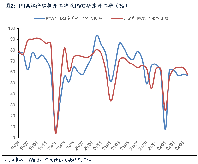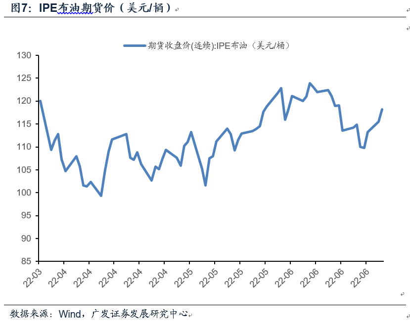 截至6月28日,IPE布油期货价录得118.2美元/桶,环比上月末下跌3.8%,相较2021年同期上涨57.3%。6月油价表现弱势:供给端OPEC+最新决议将7-8月增产计划提升至64.8万桶;需求端美联储激进加息打压市场情绪,叠加美国经济数据疲弱,下旬油价陷入深度调整。6月化工品价格指数CCPI录得5756点,环比上月末回落4.9%,其中跌幅靠前的品种包括PVC等品种。聚酯产业链中乙二醇、PTA价格环比分别录得-10.2%、-0.4%。成本端原油价格震荡回落,下游聚酯工厂开工率有所反复。PP及PVC期货价环比上月末录得-4.2%、-12.8%,需求端下游采购积极性仍较清淡,多数企业维持既定周转库存。天然橡胶期货价录得12720元/吨,环比上月末回落1.8%,6月国内汽车行业陆续复工,但下旬开工数据仍存局部反复,叠加大宗商品整体弱势影响市场交投情绪。