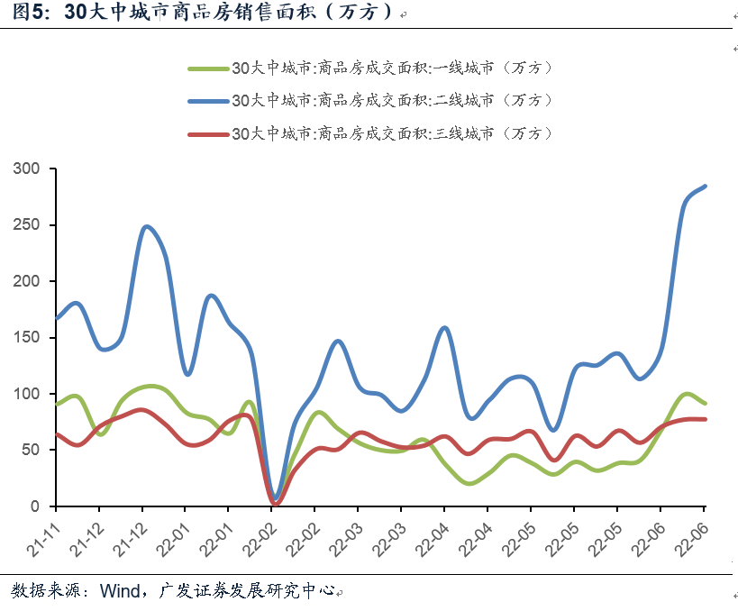 地产销售显著回暖。6月前28日30大中城市日均成交面积为52.0万方,大致与去年11-12月读数的50万方在同一量级;同比读数-13%也远高于5月的-48%。从月内分布来看,6月前四周日均值分别录得32、38、62、65万方,下旬改善幅度较大。