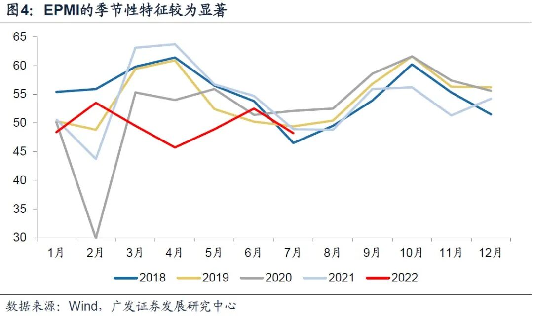 1-7月EPMI分别为48.4、53.5、49.5、45.7、48.9、52.5、48.2;与季节性均值(2017-2021年同期均值)的差值分别为-3.3、6.6、-10.2、-14.9、-6.9、-1.2、-1.4。