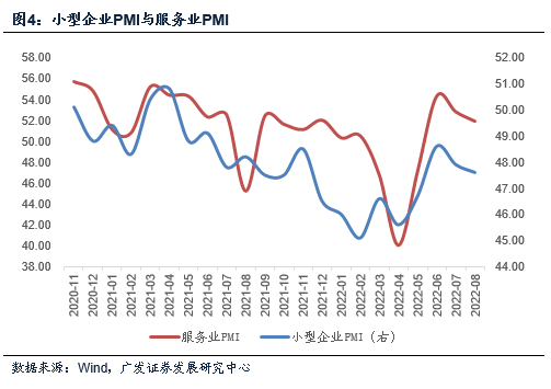 第一,8月PMI为49.4,较前值小幅上升0.4个点,与高频数据、EPMI数据指向一致。在《8月EPMI低位微升》中,我们曾指出8月PMI大概率不会继续下行。从年初以来PMI的运行轨迹看(图),1-2月相对景气高点分别为50.1、50.2;疫情影响下3-4月迅速回落至49.5、47.4;5-6月疫后恢复,PMI快速回升至49.6、50.2;7月经济显著放缓,PMI降至49.0。8月低位企稳。第二,从结构上来看,生产持平,需求好转。8月存在电力供应缺口,川渝、浙江、安徽、江苏等多省市先后启动有序用电,在这样的背景下生产指数能够持平,实际状况应该是略好于7月。需求指标低位改善,新订单、新出口订单环比前值均上行0.7个点。第三,值得注意的是,8月大企业景气度重新回到景气区间,但小企业景气度还在继续下降。我们的一个理解是大企业之中,资源型企业占比较高,它对于上游价格更为敏感(图);小企业之中,出口型和消费型企业占比较高,它对于外需订单、疫情环境更为敏感(图)。8月上游价格小幅反弹带动大企业景气度,疫情升温挤压小企业景气度。第四,原材料价格、产成品价格指数均有所反弹,但绝对值都处于45以下的低位。估计后面公布的PPI环比表现会好于7月的-1.3%,但同比回落的特征不变。从同期的大宗商品表现看,并没有典型的价格趋势出现,原油价格均值继续小幅回落,内需定价的钢价略有上行,南华综合指数略有上行。第五,服务业的景气度进一步低于7月,这一点应主要和疫情节奏有关。以“本土确诊+无症状”日均值观测,7月为日均496例,8月为日均1585例。8月海南、新疆、西藏、四川等地先后出现疫情升温。建筑业指标指向不明,建筑业PMI(经营活动)有所放缓,可能和高温影响户外条件有关;但包含订单、价格、业务活动预期之内的所有分项指标均高于前值,尤其新订单上行明显。第六,从PMI看,经济目前只是低位企稳,并未有显著修复特征;但从影响7月以来经济的五大因素看,9月经济可能会较7-8月边际修复。一是高温逐渐过去,电力供给缺口会有缓和,居民活动和户外开工也会有所上升;二是本轮疫情峰值在8月17日,16-17日在日均3000左右量级,8月下旬已有缓和;三是财政缺口进一步得到填补,8月24日国常会确认专项债限额,新增3000亿政策性开发性金融工具;四是地产政策在继续升温,22日调降5年期LPR、24日强调“一城一策”,保交楼亦在落实过程中;五是在7月诱发原材料去库存的上游价格,8月以来已不再单边下行。第七,以上只是短期经济角度,对宏观面预期来说,影响因素还会更复杂一些,它还要包含对明年及中期经济趋势的理解:一是应该如何认识中期经济增长的目标;二是疫情的影响实质性消退、消费的天花板打开会在何时出现;三是地产销售、投资下台阶之后,下一阶段固定资产投资再均衡会是什么样的路径。以上三个问题有待于进一步明晰化,这一不确定性会和短期经济趋势一起,反映在目前的市场定价中。8月PMI为49.4,较前值小幅上升0.4个点,与高频数据、EPMI数据指向一致。在《8月EPMI低位微升》中,我们曾指出8月PMI大概率不会继续下行。从年初以来PMI的运行轨迹看,1-2月年内相对景气高点分别为50.1、50.2;疫情影响下3-4月迅速回落至49.5、47.4;5-6月疫后恢复,PMI快速回升至49.6、50.2;7月经济显著放缓,PMI降至49.0。8月低位企稳。