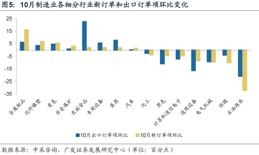 从需求端进一步理解10月中观经济。(1)8个行业订单环比改善,其中4个与建筑产业链相关(金属制品、有色、非金属矿、专用设备),此外就是化纤橡塑、农副食品、医药、汽车;(2)农副食品、医药、专用设备出口订单环比上行22.6、7.8、3.6个点,上行幅度明显超过其新订单,表明出口订单改善对这些行业整体需求构成支撑;(3)中游装备制造中,计算机、电气机械、通用设备出口订单环比分别下降7、9.2、16.2个点,我国装备行业出口依赖度高,出口订单的下降可能是导致10月中游装备行业整体景气度普遍走弱的原因。