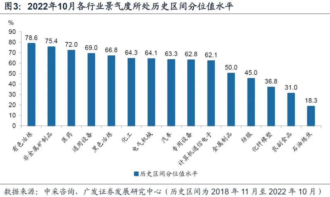 15个主要制造业细分行业中,7个行业位于景气度扩张区间,较9月减少了4个;通用设备、电气机械、石油炼焦、化工4个行业由景气扩张区间进入紧缩区间。