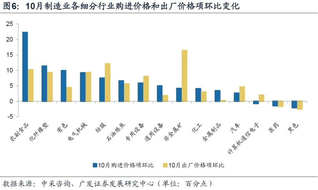 细分行业购进价格方面,15个制造业中12个行业购进价格环比上行,包括农副食品(环比上行22.3个点,下同)、化纤橡塑(11.4)、有色(9.9)、电气机械(9.2)、纺服(7.5)、石油炼焦(6.6)、通用设备(5.0)、非金属矿(4.2)、化工(4.1)、金属制品(3.4)、汽车(2.6);计算机通信电子、医药、黑色购进价格环比下降0.7、1.4和2.1个点。