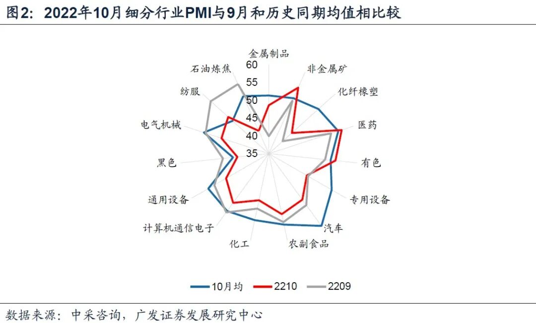 10月石油炼焦(10月PMI环比回落14.4个点,下同)、纺服(-6.6)、电气机械(-4.7)、黑色冶炼(-4.1)、通用设备(-3.8)、计算机通信电子(-3.3)、化工(-2.4)、农副食品(-2.3)、汽车(-1.9)、专用设备(-0.4)景气环比回落。