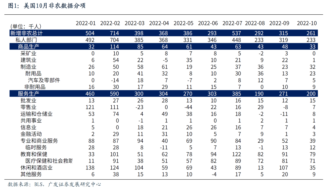 10月新增非农主要贡献项为医疗保健、专业和商业服务和休闲酒店业,分别新增7.1万人(前3月平均月增8万人)、3.9万人(前3月平均月增5.5万人)、3.5万人(前3月平均月增6.9万人)。