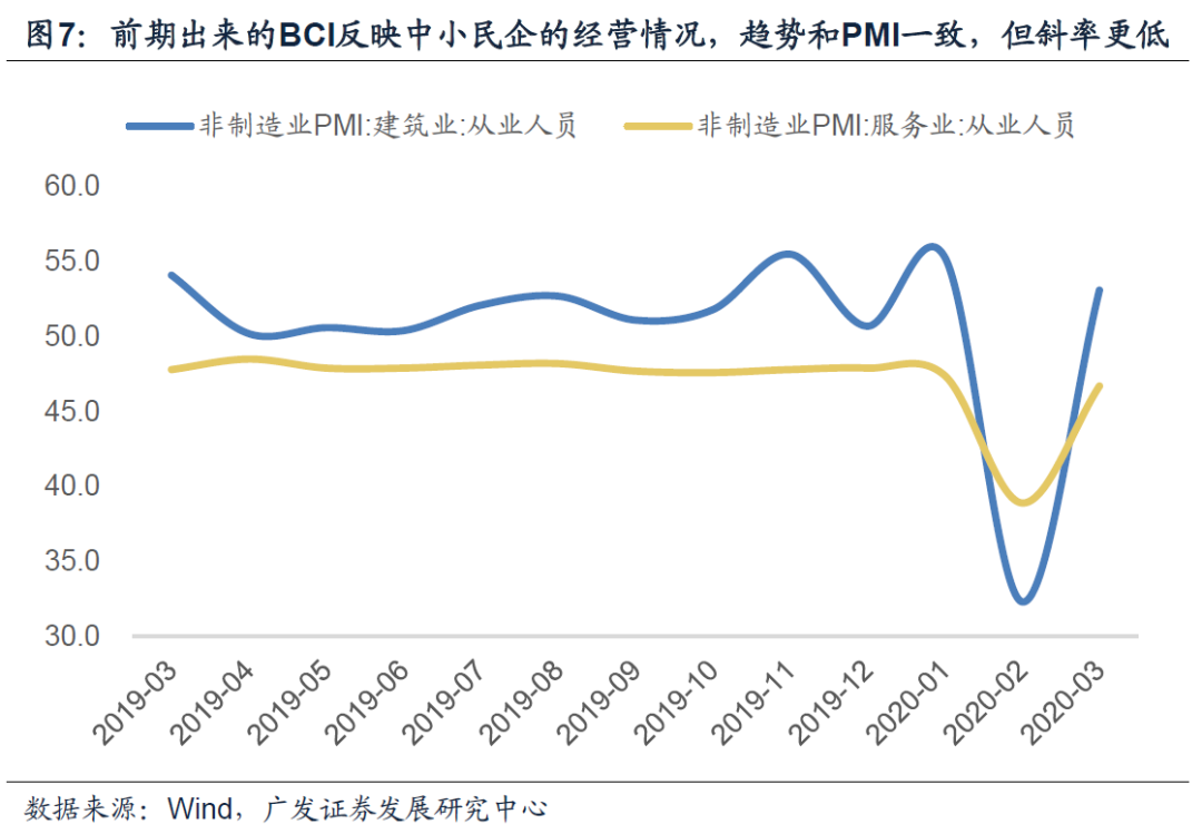 PMI本质上是一个环比概念,2至3月这种特殊情况会有一定影响。统计局的一个解释也是变化幅度与上月基数有很大关系,不能准确反映各类指标绝对值的变化。所以4月PMI会更为关键,它代表复工完成之后需求的边际力量方向。
