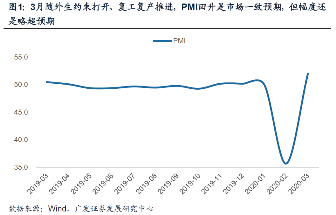2月是疫情影响最集中的时段,PMI也落至历史最低点的35.7;3月随供给约束打开、复工复产推进,PMI回升是市场一致预期,但回升至52的区间还是略超预期的。