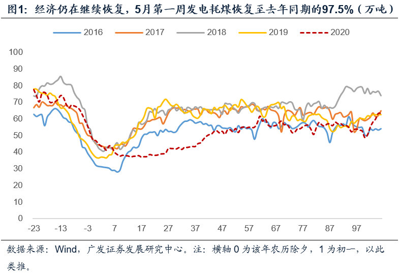 经济仍在继续恢复。5月第一周发电耗煤和30城地产销售恢复至去年同期的97.5%。全国餐饮、住宿行业消费规模恢复至去年同期70%左右;旅游市场恢复至同期的50%。伴随着复工复产,经济在逐步恢复。2月至5月第一周日均发电耗煤分别为39、53、55、56万吨,环比仍然在改善中,但幅度逐渐变小。若以春节和节后第几周为坐标对比来看,5月第一周发电耗煤和30城地产销售恢复至去年同期的97.5%。