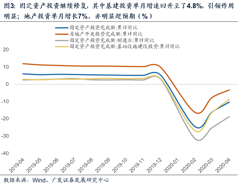 其中基建投资回升尤其明显,投资累计增速由3月的-16.4%恢复至-8.8%,隐含的单月增速已至4.8%,引领作用显著。