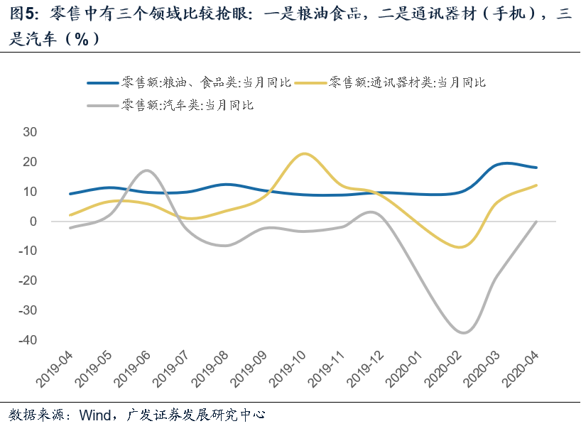 零售中有三个领域比较抢眼:一是粮油食品,继续维持近20%高增长,4月增速为18.2%,只略低于3月的19.2%;二是通讯器材(手机),增速由3月的6.5%进一步加快至12.2%;三是汽车,4月零增长,较前三个月-30%的增长大幅好转。