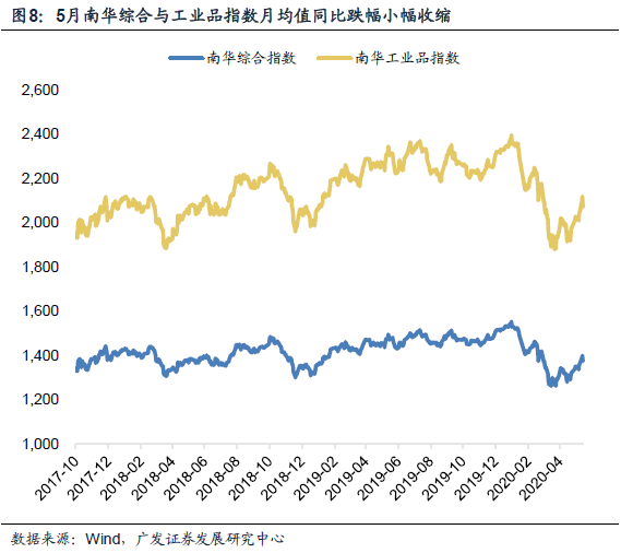 螺纹钢价格5月初震荡上行后略有回落,相较4月环比持平。Myspic综合钢价指数相较4月上涨4.8%,钢材供给上行、库存偏高,而价格韧性或对应同期建筑业需求端改善。截止5月27日,螺纹钢期货价格收于3504元/吨,环比上月末基本持平。月均值同比下跌8.6%,3月、4月同比分别为-8.1%和-16.4%。Myspic综合钢价指数录得135.1,相较4月末上涨4.8%。动力煤期货价格自上月底部开始回升,截止5月27日收于487元/吨,同比回落幅度相较上月-22.0%略有改观。伴随国内工业生产加快复苏,原材料价格普遍改善。截止5月27日,南华综合指数和南华工业品指数月均值环比上涨4.2%、4.6%,同比分别录得-6.9%、-10.3%,增速相较上月分别上行3.2、3.0个百分点。