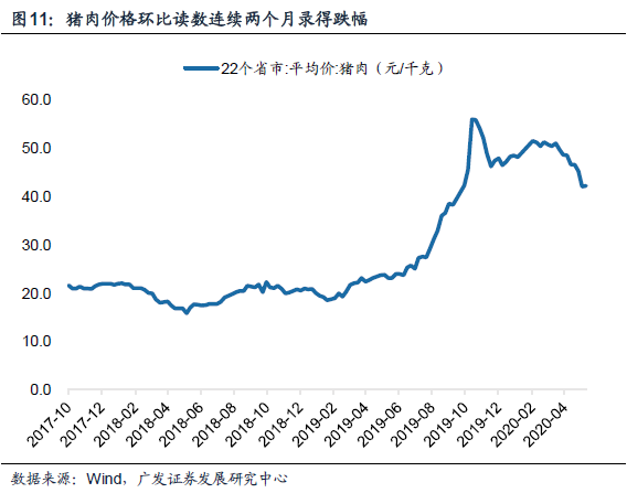 猪价方面,截止5月22日,22个省市猪肉平均价录得42.2元/千克,较4月末价格下行9.6%,环比读数连续两个月录得跌幅;月均值同比录得83%,较上月同比增速111%斜率趋缓。国内生猪产能逐渐恢复以及国家对猪肉市场的有效调控使国内生猪产能逐步好转,猪肉价格持续回落。同时,学校、餐饮企业仍未完全开学、复工,团体消费仍然低迷,加之季节性阻力,屠宰厂具备促销动力,猪肉价格逐步降温。预计疫情后期国内全面复工复产、院校开学后,猪肉终端消费增加,猪肉价格回升可能性取决于终端消费需求和产能供给的相对调整预期。