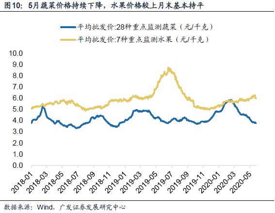 供给改善快于需求修复,猪肉、蔬菜价格月度数据仍继续下行;下旬猪肉价格有企稳特征。从高频数据看,CPI下行的趋势不变。截止5月27日,7种重点监测水果平均批发价较4月底环比上升0.3%;蔬菜价格方面,28种重点监测蔬菜平均批发价较4月底下行9.1%。蔬菜价格周度同比(-10.0%、-7.7%、-3.0%、-3.6%)有所改善,但价格水平自2月下旬持续下行,且目前已回落接近2019年的价格低点。天气转暖,蔬菜供应量上升、需求相对稳定为蔬菜价格持续下降主要因素,果蔬价格整体表现符合季节性。猪价方面,截止5月22日,22个省市猪肉平均价录得42.2元/千克,较4月末价格下行9.6%,环比读数连续两个月录得跌幅;月均值同比录得83%,较上月同比增速111%斜率趋缓。国内生猪产能逐渐恢复以及国家对猪肉市场的有效调控使国内生猪产能逐步好转,猪肉价格持续回落。同时,学校、餐饮企业仍未完全开学、复工,团体消费仍然低迷,加之季节性阻力,屠宰厂具备促销动力,猪肉价格逐步降温。预计疫情后期国内全面复工复产、院校开学后,猪肉终端消费增加,猪肉价格回升可能性取决于终端消费需求和产能供给的相对调整预期。粮食价格方面,5月主要粮食期货结算价均呈现下行趋势。截止5月27日,黄玉米价格高位下跌,较4月录得1.5%跌幅;黄大豆价格下跌,较4月录得0.8%跌幅,下半旬再现回升迹象;小麦、粳稻等粮价相对稳定。