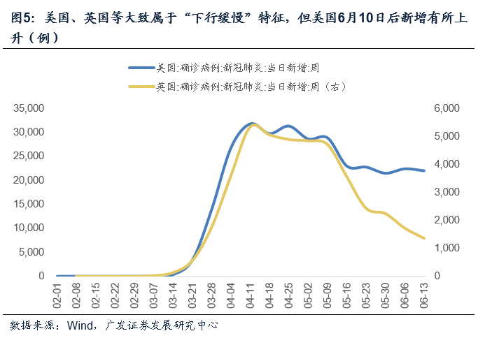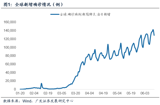 第一,从新冠疫情全球新增确诊看,3月中旬至4月上旬是上升期,4月中旬至5月中旬是平台期,5月中旬至今又经历了一轮中枢抬升。