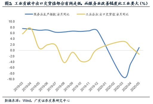 5月工业增加值增速为4.4%,较上月抬升0.5个点;服务业增加值增速为1%,较上月抬升5.5个点;4月是工业改善幅度比服务业要大;而本月服务业改善幅度比工业要大。工业可能一定程度上受出口交货值影响,5月出口交货值增速为-1.4%,低于上月的1.1%。